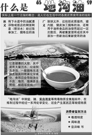 研究表明,長期攝入地溝油會(huì)對(duì)人體造成明顯傷害,如發(fā)育障礙、易患腸炎,并有肝、心和腎腫大以及脂肪肝等病變。而地溝油中的主要危害物之一黃曲霉素是一種強(qiáng)烈的致癌物質(zhì),其毒性是砒霜的100倍。另一個(gè)問題是倫理上的,別人吃過的油,在下水道里變質(zhì),再撈上來,你能吃得下去嗎? 那么,有沒有一種簡便的方法,可以鑒別地溝油呢?我們不妨聽聽食品科學(xué)專家和業(yè)內(nèi)人士怎么說。 1、科學(xué)鑒別地溝油 目前沒有好辦法 在一個(gè)注重食品安全的時(shí)代,理想的狀態(tài)是,你下館子,隨手掏出一張?jiān)嚰埥讲死?過一會(huì)兒拿出來跟譜表比比,然后大叫:“掌柜的,換油!” 2、傳統(tǒng)的檢測方法 都有一定局限性 在科研工作者看來,治理地溝油的難點(diǎn)在于,經(jīng)過洗滌、蒸餾、脫色、脫臭等精煉過程后,單從外觀和感官上,很難區(qū)分地溝油和普通油。不法商販還會(huì)把地溝油摻入食用油中,如果含量較少,更是難以檢測。 3、鑒別地溝油 冰箱顯身手? 曾在北京多家大酒樓擔(dān)任總廚、高管的特級(jí)廚師馮鵬說,一般情況下,地溝油和普通油無法區(qū)分,進(jìn)貨時(shí)難免上當(dāng)。他只能通過實(shí)踐來判斷:飯館炒菜之前一般要先過油,在這道“滑油”工序中,好油可反復(fù)使用七八次,而地溝油最多使用三次就會(huì)變黏,而且有哈喇味兒。 “另外,室外溫度較低時(shí),地溝油會(huì)像棕櫚油一樣凝固,所以常有人用地溝油冒充棕櫚油。”馮鵬說,冬天可以據(jù)此鑒別地溝油,夏天則可通過冰箱來檢驗(yàn)。一些媒體認(rèn)為地溝油有味道,可以聞出來,此外里面含水多,下鍋會(huì)爆響,馮鵬認(rèn)為這些都是無稽之談,因?yàn)樗緭讲贿M(jìn)油中,且地溝油也沒什么異味。 4、我們該如何 鑒別地溝油? 一看。看透明度,純凈的植物油呈透明狀,在生產(chǎn)過程中由于混入了堿脂、蠟質(zhì)、雜質(zhì)等物,透明度會(huì)下降;看色澤,純凈的油為無色,在生產(chǎn)過程中由于油料中的色素溶于油中,油才會(huì)帶色;看沉淀物,其主要成分是雜質(zhì)。 二聞。每種油都有各自獨(dú)特的氣味。可以在手掌上滴一兩滴油,雙手合攏摩擦,發(fā)熱時(shí)仔細(xì)聞其氣味。有異味的油,說明質(zhì)量有問題,有臭味的很可能就是地溝油;若有礦物油的氣味更不能買。 三嘗。用筷子取一滴油,仔細(xì)品嘗其味道。口感帶酸味的油是不合格產(chǎn)品,有焦苦味的油已發(fā)生酸敗,有異味的油可能是地溝油。 四聽。取油層底部的油一兩滴,涂在易燃的紙片上,點(diǎn)燃并聽其響聲。燃燒正常無響聲的是合格產(chǎn)品;燃燒不正常且發(fā)出“吱吱”聲音的,水分超標(biāo),是不合格產(chǎn)品;燃燒時(shí)發(fā)出“噼啪”爆炸聲,表明油的含水量嚴(yán)重超標(biāo),而且有可能是摻假產(chǎn)品,絕對(duì)不能購買。 五問。問商家的進(jìn)貨渠道,必要時(shí)索要進(jìn)貨發(fā)票或查看當(dāng)?shù)厥称沸l(wèi)生監(jiān)督部門抽樣檢測報(bào)告。 |