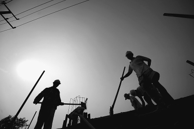 7月5日,山東濟南烈日當空,在共青團路附近一處建筑工地,農民工依然堅守崗位。